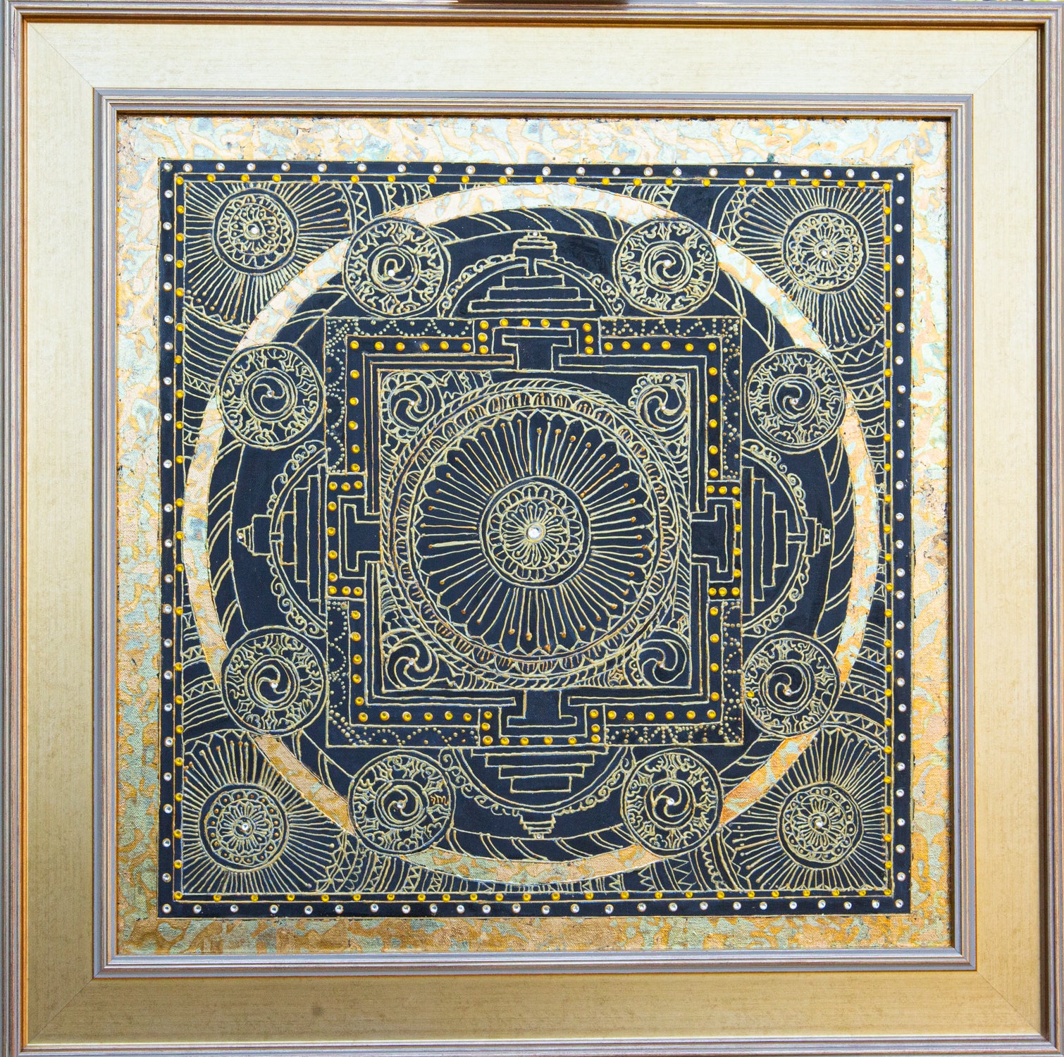 This breathtaking mandala by Marilyn is an ode to sacred geometry — a visual hymn to the architecture of the universe. Hand-painted in deep midnight tones and adorned with radiant gold detailing and jewel-like embellishments, the piece draws the viewer inward, layer by layer, toward the luminous stillness at its center.