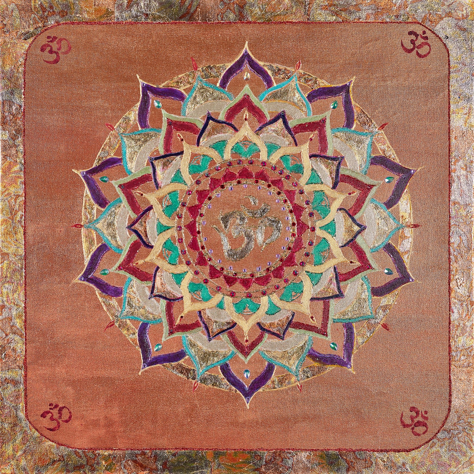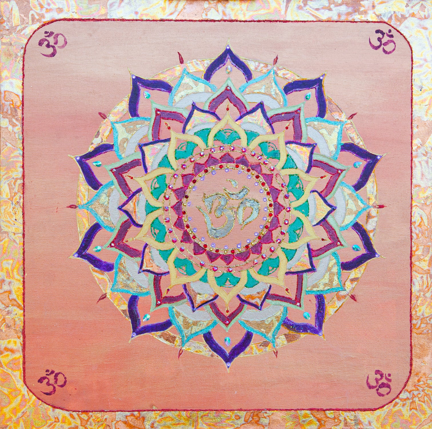This luminous mandala by Marilyn radiates harmony and divine resonance, centering around the sacred symbol Om — the primordial vibration believed to be the sound from which all existence emerged. With soft blush tones, shimmering gold, and layers of jewel-toned petals, Marilyn transforms this ancient symbol into a living expression of cosmic unity.