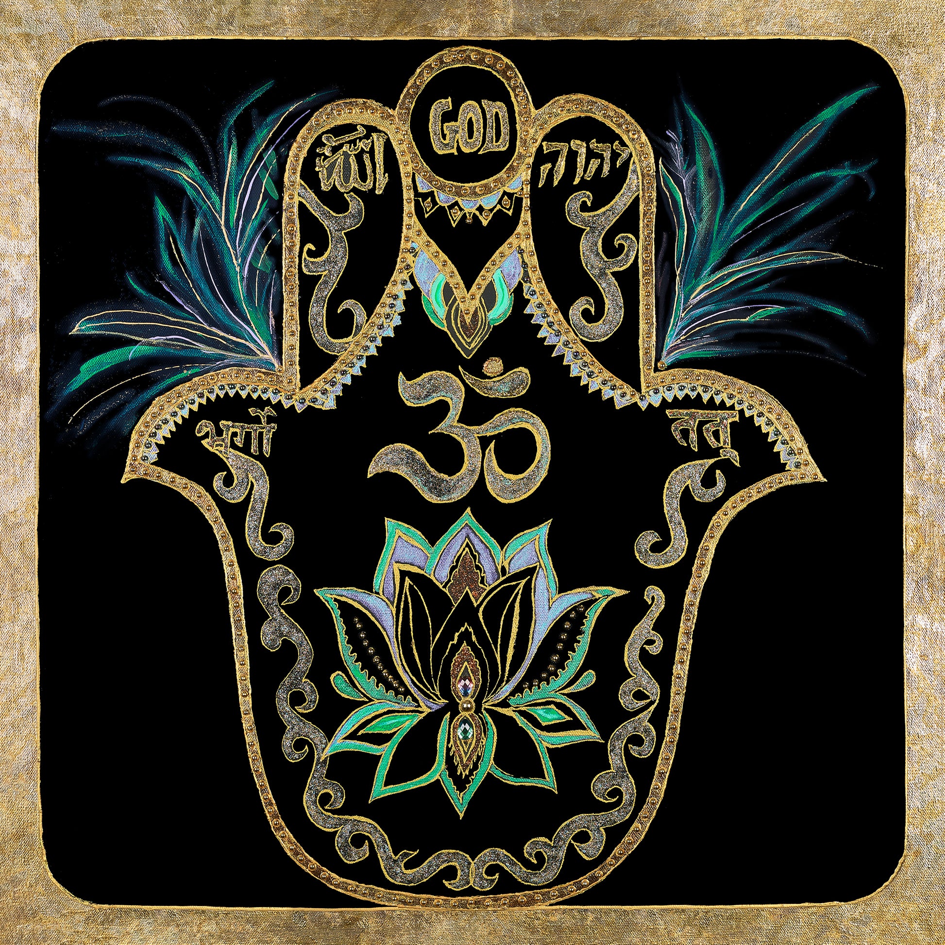 This powerful and transcendent piece by Marilyn unites the world’s great spiritual traditions in a single vision of divine harmony. Centered within a radiant Hamsa — the ancient symbol of protection and blessing — the word God is inscribed alongside sacred scripts from Hebrew, Arabic, and Sanskrit, representing the universal truth that all paths lead to the same Source.
