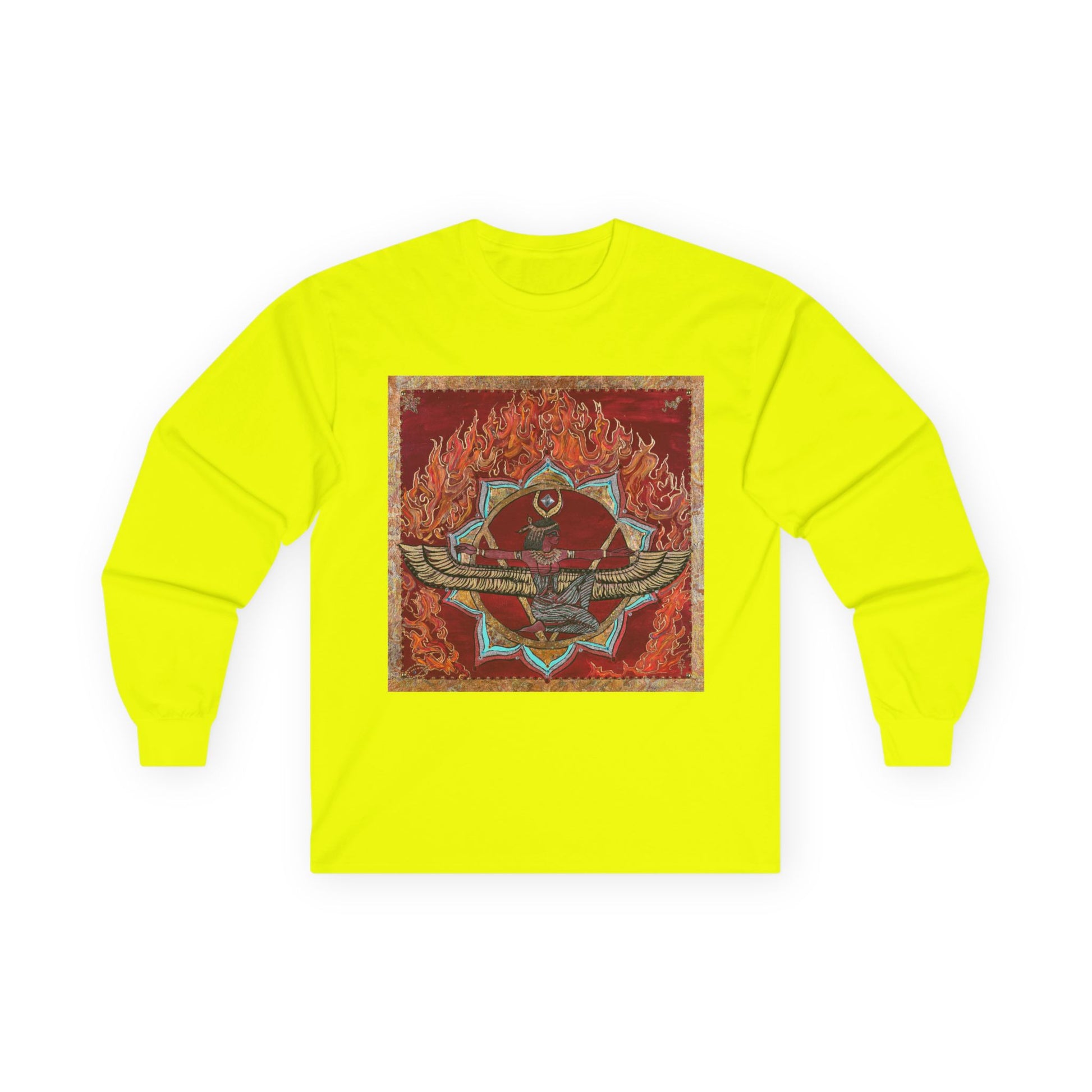 This long-sleeve tee carries a vintage, slightly worn-in vibe that feels like an old favorite you just rediscovered. The bold, fiery emblem printed on the chest reads like a weathered patch from a road-worn jacket — layered reds, muted golds and distressed edges create an adventurous, rebel energy. Wear it on crisp evenings when you want warmth without bulk. The medium-weight cotton holds its shape and the ribbed cuffs keep sleeves in place while the tubular knit construction gives a clean, seam-free silhouette. It sits in that sweet spot between lived-in comfort and statement-making style, blending nostalgia with everyday practicality.