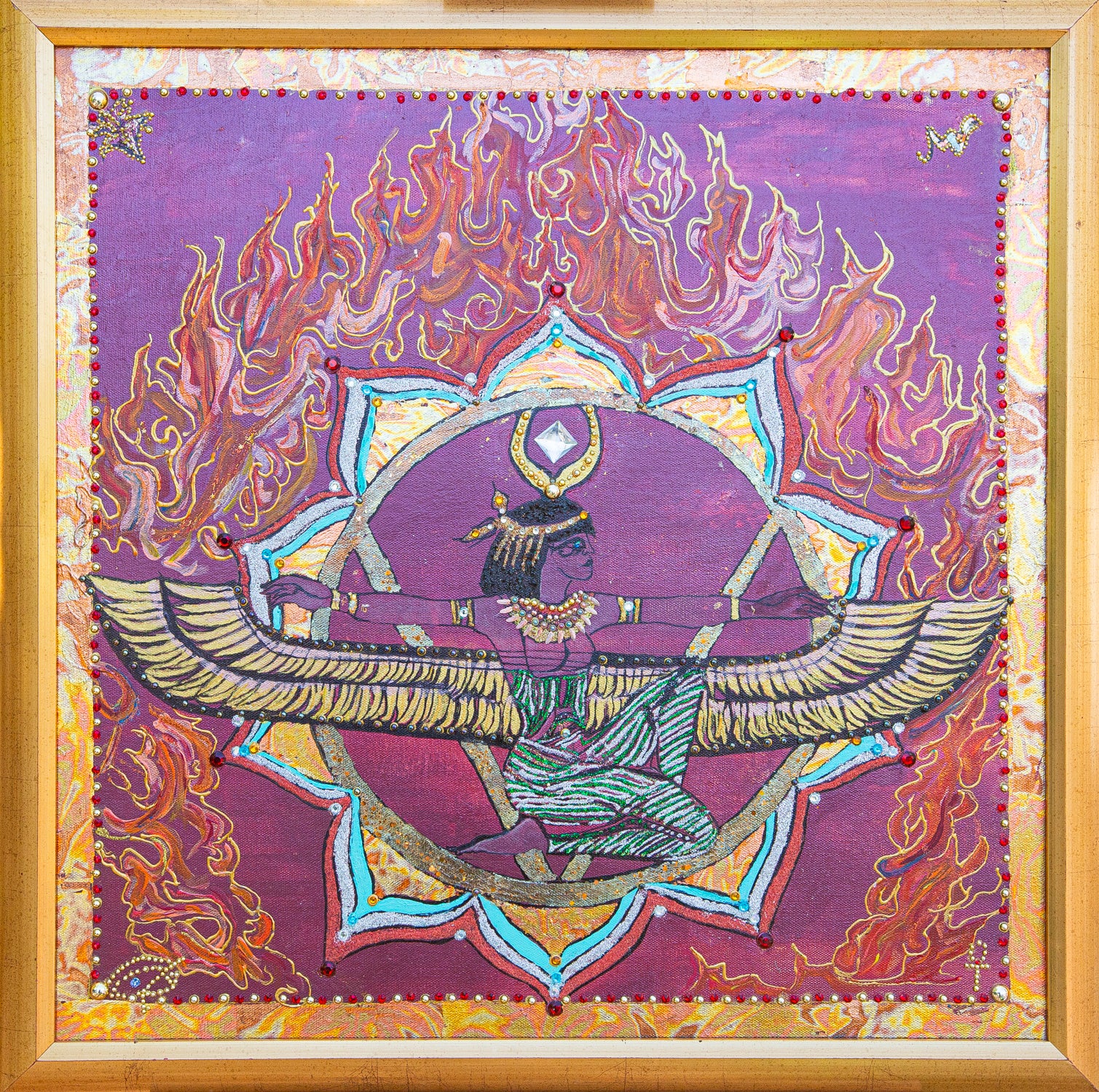 This radiant painting by Marilyn honors Isis, the Egyptian goddess of magic, healing, and divine motherhood. Depicted with outstretched wings of protection, Isis rises from a lotus of flame — a powerful symbol of transformation, rebirth, and eternal love.